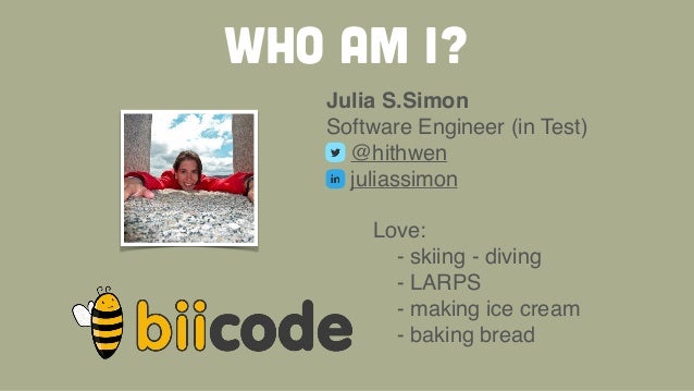 3. 3. wHO AM I? Julia S.Simon! Software Engineer (in Test)! @hithwen! juliassimon