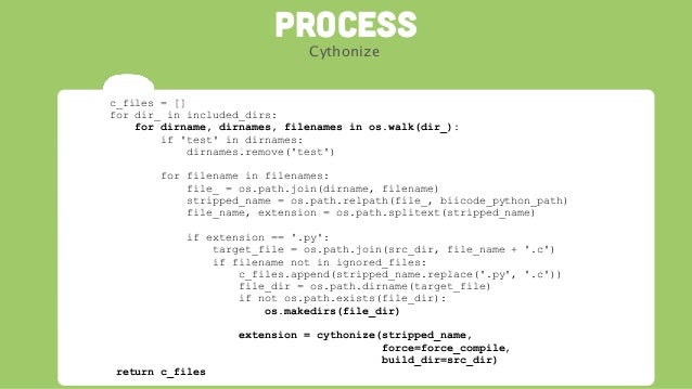 9. 9. 9 Process Cythonize c_files = [] for dir_ in included_dirs: for dirname, dirnames, filenames in os.walk(dir_): if 'test' in dirnames: dirnames.remove('test') for filename in filenames: file_ = os.path.join(dirname, filename) stripped_name = os.path.relpath(file_, biicode_python_path) file_name, extension = os.path.splitext(stripped_name) if extension == '.py': target_file = os.path.join(src_dir, file_name + '.c') if filename not in ignored_files: c_files.append(stripped_name.replace('.py', '.c')) file_dir = os.path.dirname(target_file) if not os.path.exists(file_dir): os.makedirs(file_dir) extension = cythonize(stripped_name, force=force_compile, build_dir=src_dir) return c_files