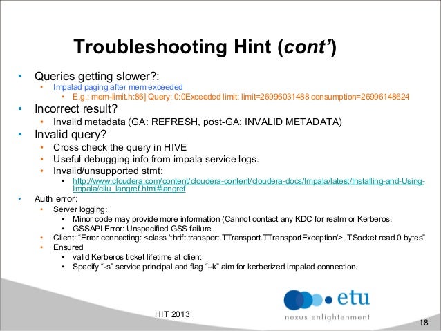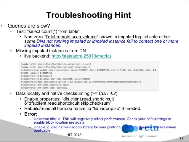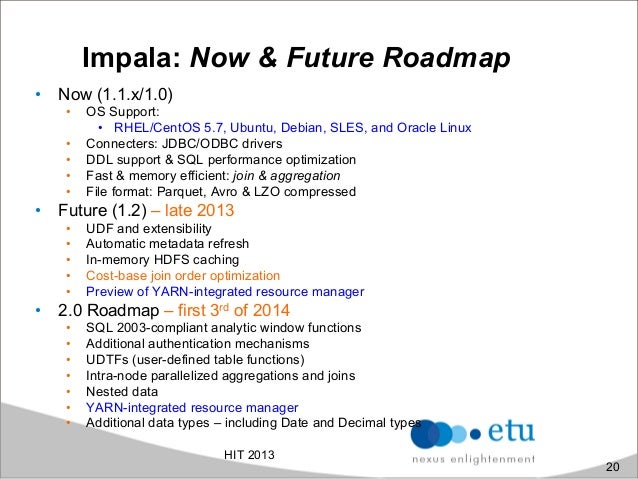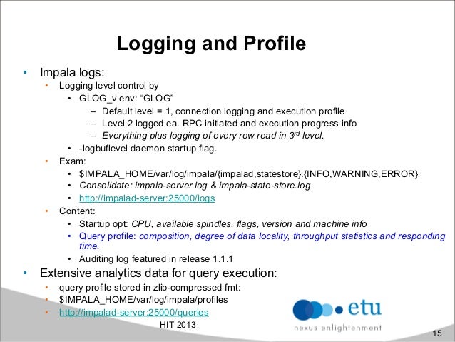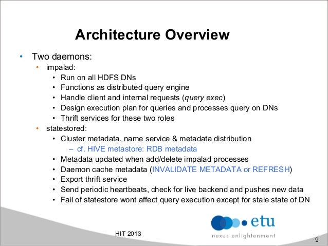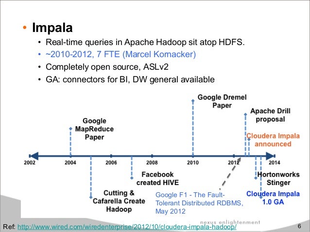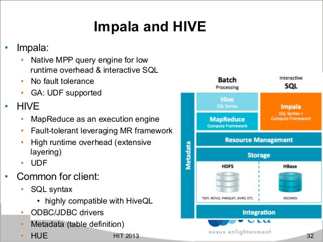 Cloudera Impala is an open-source under Apache Licence enable real-time, interactive analytical SQL queries of the data stored in HBase or HDFS. The work was inspired by Google Dremel paper which is also the basis for Google BigQuery. It provide access same unified storage platform base on it's own distributed query engine but does not use mapreduce. In addition, it use also the same metadata, SQL syntax (HiveQL-like) ODBC driver and user interface (Hue Beeswax) as Hive. Besides the traditional Hadoop approach, aim to provide low-cost solution for resiliency and batch-oriented distributed data processing, we found more and more effort in the Big Data world pursuing the right solution for ad-hoc, fast queries and realtime data processing for large datasets. In this presentation, we'll explore how to run interactive queries inside Impala, advantages of the approach, architecture and understand how it optimizes data systems including also practical performance analysis.