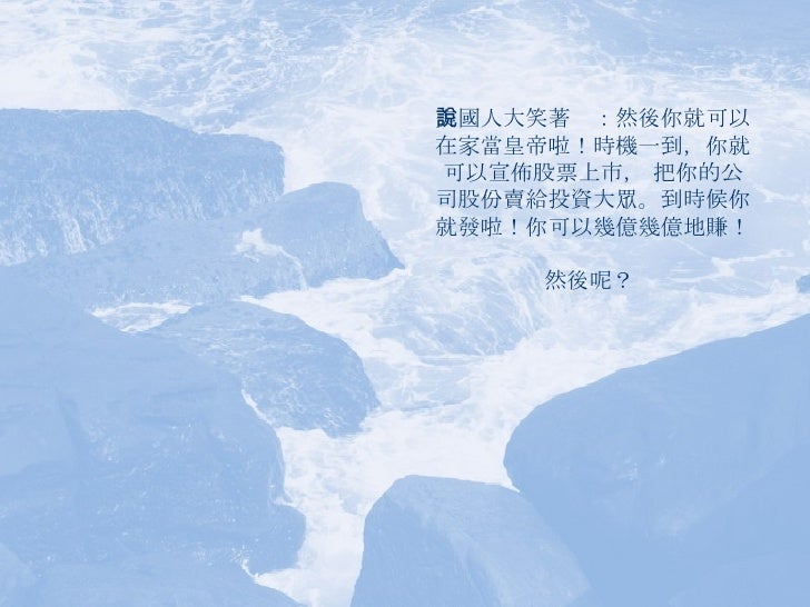 13. 13. 美國人大笑著說:然後你就可以在家當皇帝啦!時機一到,你就可以宣佈股票上市, 把你的公司股份賣給投資大眾。到時候你就發啦!你可以幾億幾億地賺! 然後呢?