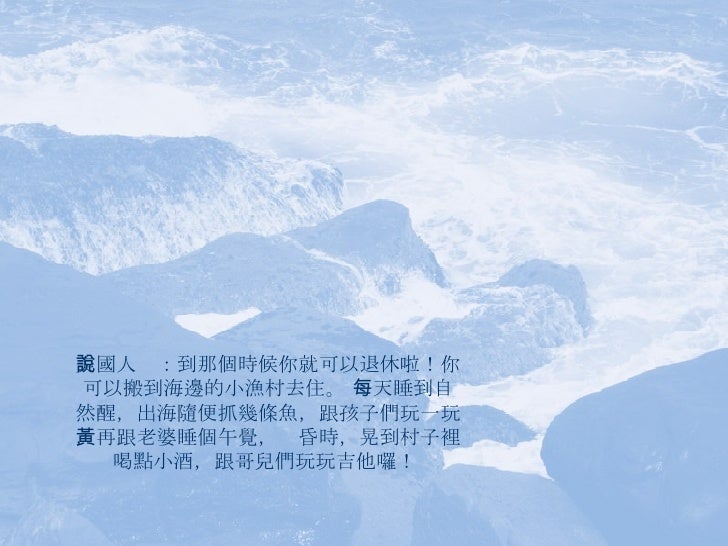 14. 14. 美國人說:到那個時候你就可以退休啦!你可以搬到海邊的小漁村去住。 每天睡到自然醒,出海隨便抓幾條魚,跟孩子們玩一玩,再跟老婆睡個午覺,黃昏時,晃到村子裡喝點小酒,跟哥兒們玩玩吉他囉!