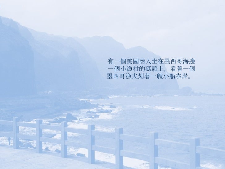 2. 2. 有一個美國商人坐在墨西哥海邊一個小漁村的碼頭上,看著一個墨西哥漁夫划著一艘小船靠岸。