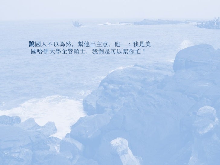 7. 7. 美國人不以為然,幫他出主意,他說:我是美國哈佛大學企管碩士,我倒是可以幫你忙!