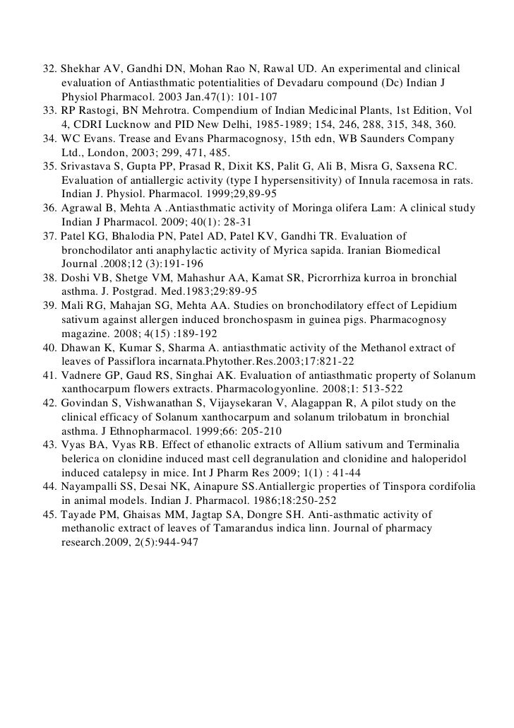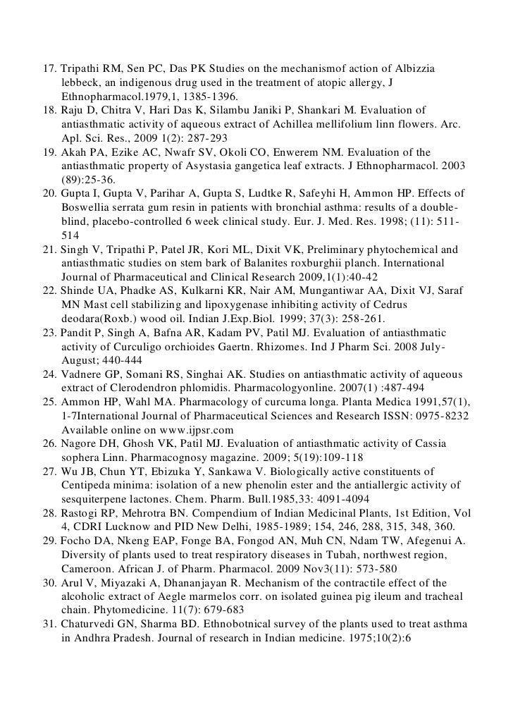 בפירסום זה יש הסבר בסיסי על מהות המחלה, הסימפטומים שלה והביטוי הקליני שלה. מתוארים מנגנונים בסיסיים של המחלה ויש רשימה של הצמחים הנהוגים לטיפול באסתמה ברפואה ההודית ומהם החומרים הפעילים בהם.