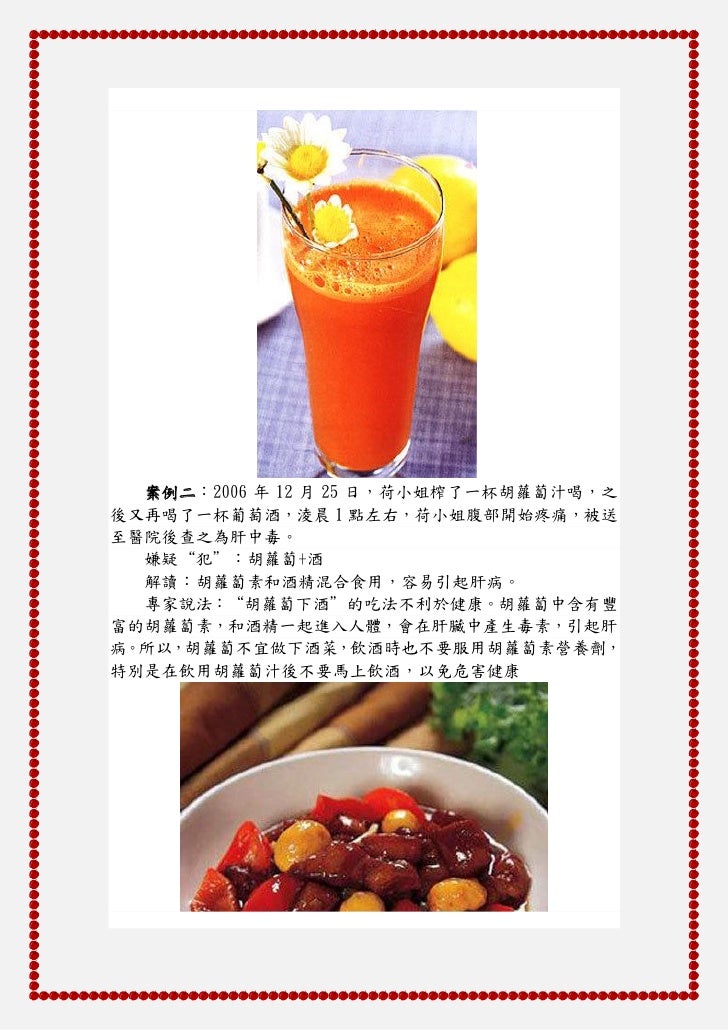 2. 2. 案例二:2006 年 12 月 25 日,荷小姐榨了一杯胡蘿蔔汁喝,之後又再喝了一杯葡萄酒,淩晨 1 點左右,荷小姐腹部開始疼痛,被送至醫院後查之為肝中毒。 嫌疑“犯”:胡蘿蔔+酒 解讀:胡蘿蔔素和酒精混合食用,容易引起肝病。 專家說法:“胡蘿蔔下酒”的吃法不利於健康。胡蘿蔔中含有豐富的胡蘿蔔素,和酒精一起進入人體,會在肝臟中產生毒素,引起肝病。所以,胡蘿蔔不宜做下酒菜,飲酒時也不要服用胡蘿蔔素營養劑,特別是在飲用胡蘿蔔汁後不要馬上飲酒,以免危害健康