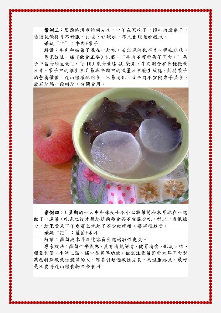 3. 3. 案例三:廣西柳州市的胡先生,中午在家吃了一頓牛肉燉栗子,隨後就覺得胃不舒服,打嗝,吐酸水,不久出現嘔吐症狀。 嫌疑“犯”:牛肉+栗子 解讀:牛肉和板栗子混在一起吃,易出現消化不良、嘔吐症狀。 專家說法:據《飲食正要》記載:“牛肉不可與栗子同食。”栗子中富含維生素 C,每 100 克含量達 40 毫克。牛肉則含有多種微量元素。栗子中的維生素 C 易與牛肉中的微量元素發生反應,削弱栗子的營養價值,這兩種搭配同食,不易消化。故牛肉不宜與栗子共食,最好間隔一段時間,分開食用。 案例四:上星期的一天中午林女士不小心將蘿蔔和木耳混在一起做了一道菜,吃完之後才想起這兩種食品不宜混合吃,所以一直很擔心,結果當天下午皮膚上就起了不少紅疙瘩,癢得很難受。 嫌疑“犯”:蘿蔔+木耳 解讀:蘿蔔與木耳混吃容易引起過敏性皮炎。 專家說法:蘿蔔性平微寒,具有清熱解毒、健胃消食、化痰止咳、順氣利便、生津止渴、補中益胃等功效。但需注意蘿蔔與木耳同食對某些特殊敏感性體質的人,容易引起過敏性皮炎。為健康起見,最好是不要將這兩種食物混合食用。