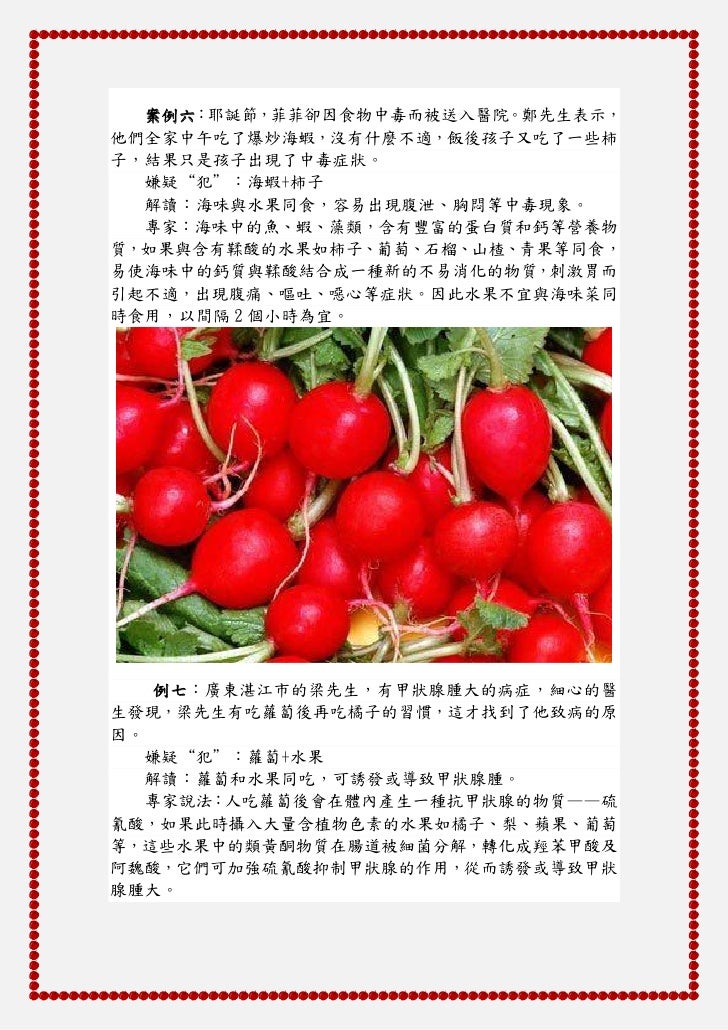 5. 5. 案例六:耶誕節,菲菲卻因食物中毒而被送入醫院。鄭先生表示,他們全家中午吃了爆炒海蝦,沒有什麼不適,飯後孩子又吃了一些柿子,結果只是孩子出現了中毒症狀。 嫌疑“犯”:海蝦+柿子 解讀:海味與水果同食,容易出現腹泄、胸悶等中毒現象。 專家:海味中的魚、蝦、藻類,含有豐富的蛋白質和鈣等營養物質,如果與含有鞣酸的水果如柿子、葡萄、石榴、山楂、青果等同食,易使海味中的鈣質與鞣酸結合成一種新的不易消化的物質,刺激胃而引起不適,出現腹痛、嘔吐、噁心等症狀。因此水果不宜與海味菜同時食用,以間隔 2 個小時為宜。 例七:廣東湛江市的梁先生,有甲狀腺腫大的病症,細心的醫生發現,梁先生有吃蘿蔔後再吃橘子的習慣,這才找到了他致病的原因。 嫌疑“犯”:蘿蔔+水果 解讀:蘿蔔和水果同吃,可誘發或導致甲狀腺腫。 專家說法:人吃蘿蔔後會在體內產生一種抗甲狀腺的物質——硫氰酸,如果此時攝入大量含植物色素的水果如橘子、梨、蘋果、葡萄等,這些水果中的類黃酮物質在腸道被細菌分解,轉化成羥苯甲酸及阿魏酸,它們可加強硫氰酸抑制甲狀腺的作用,從而誘發或導致甲狀腺腫大。