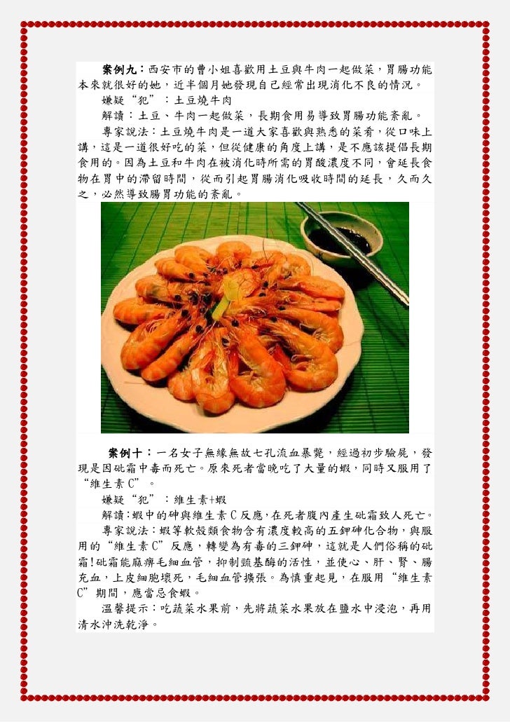7. 7. 案例九:西安市的曹小姐喜歡用土豆與牛肉一起做菜,胃腸功能本來就很好的她,近半個月她發現自己經常出現消化不良的情況。 嫌疑“犯”:土豆燒牛肉 解讀:土豆、牛肉一起做菜,長期食用易導致胃腸功能紊亂。 專家說法:土豆燒牛肉是一道大家喜歡與熟悉的菜肴,從口味上講,這是一道很好吃的菜,但從健康的角度上講,是不應該提倡長期食用的。因為土豆和牛肉在被消化時所需的胃酸濃度不同,會延長食物在胃中的滯留時間,從而引起胃腸消化吸收時間的延長,久而久之,必然導致腸胃功能的紊亂。 案例十:一名女子無緣無故七孔流血暴斃,經過初步驗屍,發現是因砒霜中毒而死亡。原來死者當晚吃了大量的蝦,同時又服用了“維生素 C”。 嫌疑“犯”:維生素+蝦 解讀 蝦中的砷與維生素 C 反應 在死者腹內產生砒霜致人死亡。 : , 專家說法:蝦等軟殼類食物含有濃度較高的五鉀砷化合物,與服用的“維生素 C”反應,轉變為有毒的三鉀砷,這就是人們俗稱的砒霜!砒霜能麻痹毛細血管,抑制巰基酶的活性,並使心、肝、腎、腸充血,上皮細胞壞死,毛細血管擴張。為慎重起見,在服用“維生素C”期間,應當忌食蝦。 溫馨提示:吃蔬菜水果前,先將蔬菜水果放在鹽水中浸泡,再用清水沖洗乾淨。
