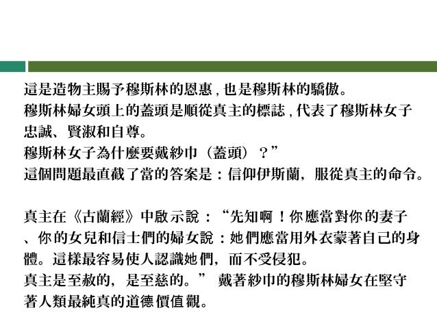 2. 2. 美麗大方、端莊秀麗;儀態萬千而又風情萬種,但不風騷,也不放蕩。就像雍容華貴的明珠,微露光華,而又魅力四射,擁有著獨立的人格美和尊嚴美。這是造物主賜予穆斯林的恩惠,也是穆斯林的驕傲。 穆斯林婦女頭上的蓋頭是順從真主的標誌,代表了穆斯林女子忠誠、賢淑和自尊。戴上蓋頭的女子讓人們以品 和才智德尊敬 ,而不是把眼光集中在 的容貌上,因此,戴蓋頭不她 她是向男人們屈服,而是避開男人們惡習,不給他們淫念的機會,是女子自我保護和自尊自愛的行為。 穆斯林女子遵從真主的命令戴上蓋頭走上街﹐是向社會莊嚴宣穆斯林的身 和 心的信仰。佈 份 內