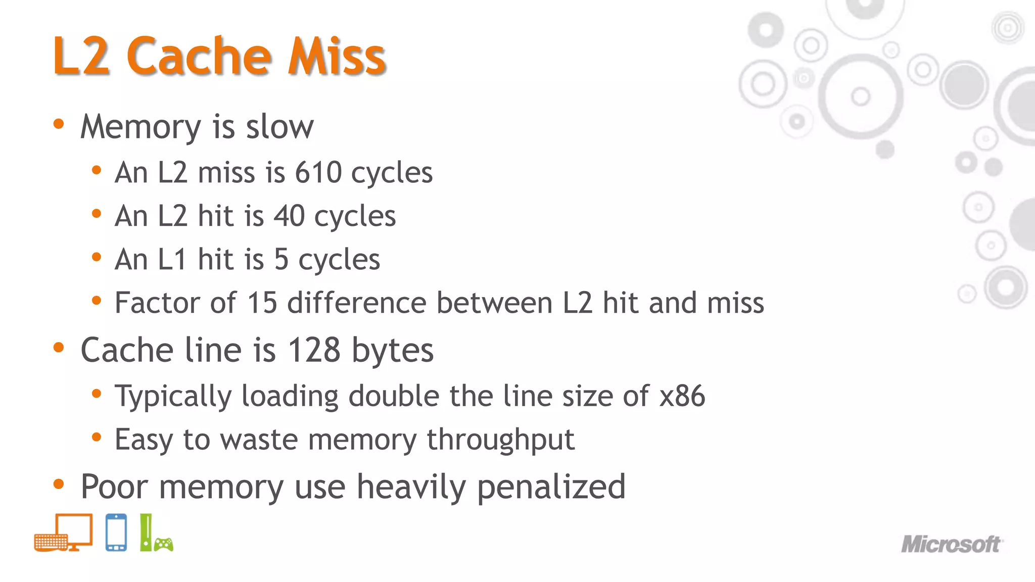 7. 7. Performance of Ported Code<br />Code ported to PS3 or 360 CPU may surprise<br />And not in a good way<br />360 naïve port can be 10x slower than Windows<br />Lua tasks can be in that range<br />But the processor is 3.2Ghz, why the slowdown?<br />CPU cores are cut down to reduce cost<br />Memory system lower spec<br />Cheap slow memory, smaller caches, no L3<br />