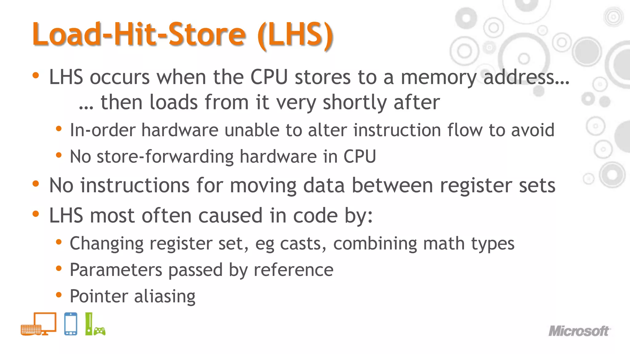 11. 11. Load-Hit-Store (LHS)<br />LHS occurs when the CPU stores to a memory address… … then loads from it very shortly after<br />In-order hardware unable to alter instruction flow to avoid<br />No store-forwarding hardware in CPU<br />No instructions for moving data between register sets<br />LHS most often caused in code by:<br />Changing register set, eg casts, combining math types<br />Parameters passed by reference<br />Pointer aliasing<br />
