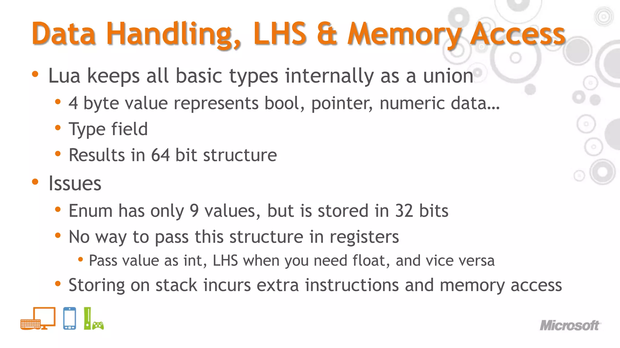 16. 16. Data Handling, LHS & Memory Access<br />Lua keeps all basic types internally as a union<br />4 byte value represents bool, pointer, numeric data…<br />Type field<br />Results in 64 bit structure<br />Issues<br />Enum has only 9 values, but is stored in 32 bits<br />No way to pass this structure in registers<br />Pass value as int, LHS when you need float, and vice versa<br />Storing on stack incurs extra instructions and memory access<br />