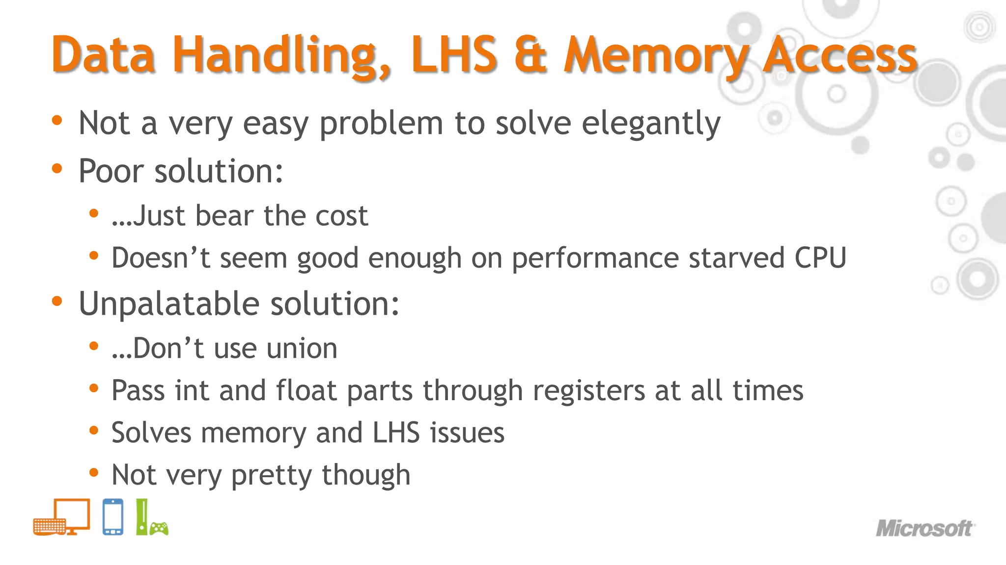 17. 17. Data Handling, LHS & Memory Access<br />Not a very easy problem to solve elegantly<br />Poor solution:<br />…Just bear the cost<br />Doesn’t seem good enough on performance starved CPU<br />Unpalatable solution:<br />…Don’t use union<br />Pass int and float parts through registers at all times<br />Solves memory and LHS issues<br />Not very pretty though<br />