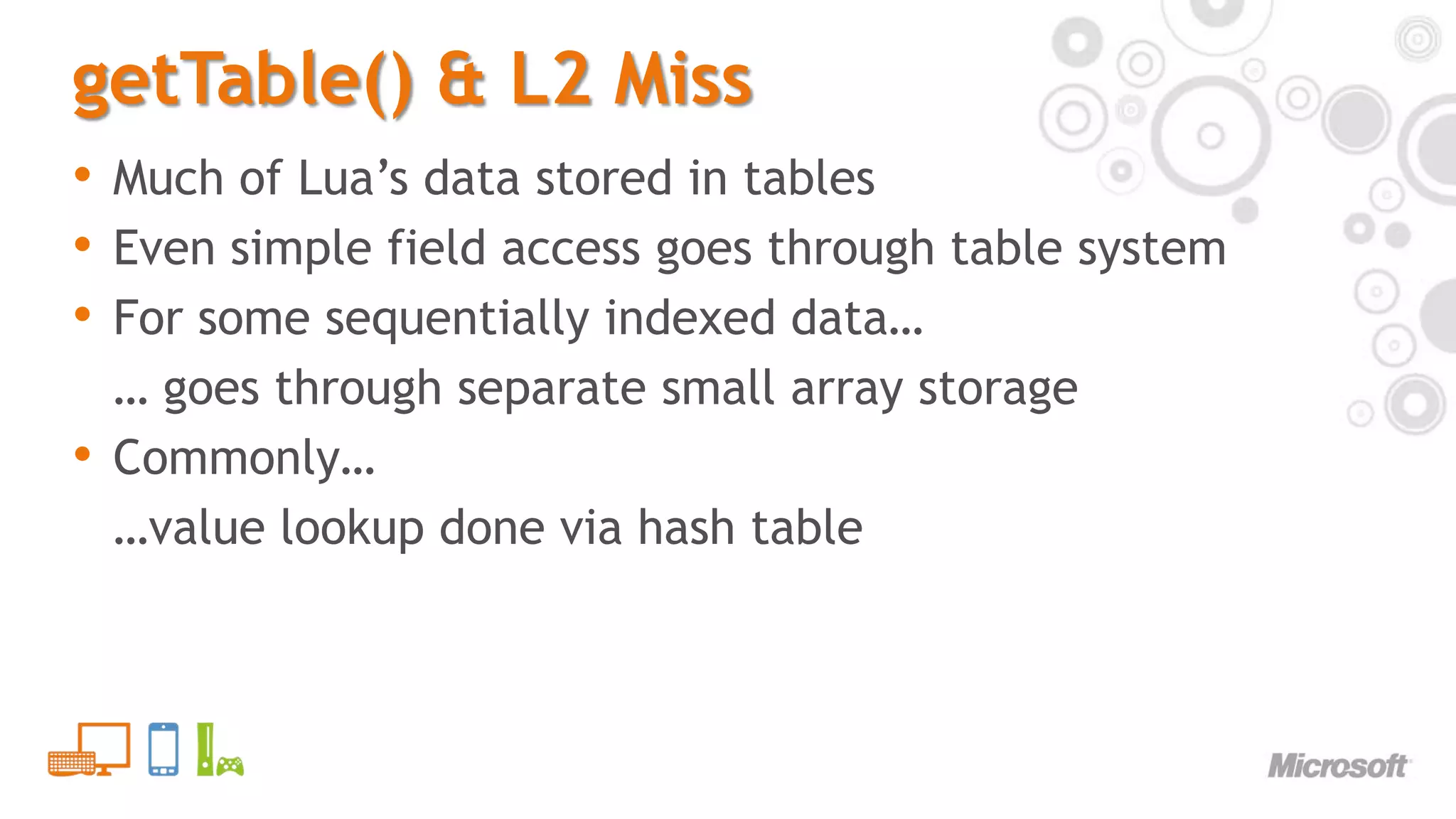 19. 19. getTable() & L2 Miss<br />Much of Lua’s data stored in tables<br />Even simple field access goes through table system<br />For some sequentially indexed data…<br /> … goes through separate small array storage<br />Commonly…<br /> …value lookup done via hash table<br />