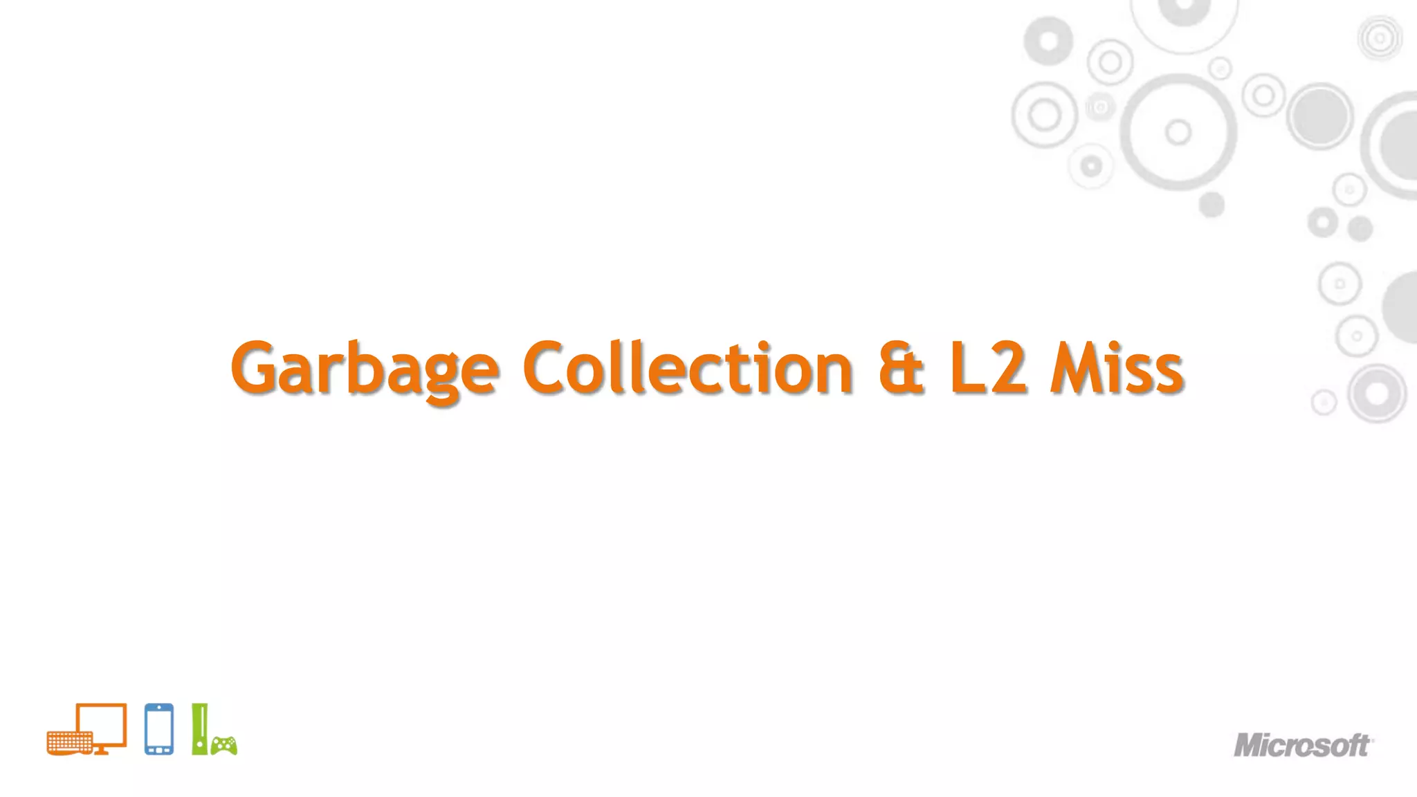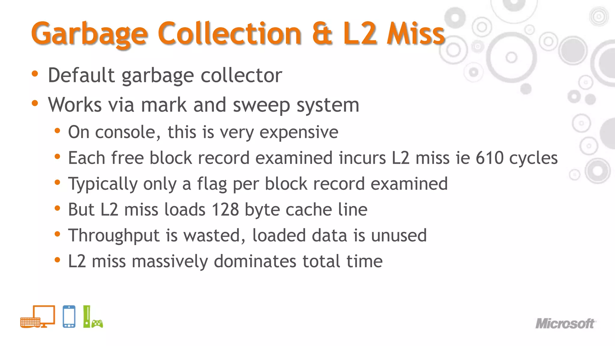 24. 24. Garbage Collection & L2 Miss<br />Default garbage collector<br />Works via mark and sweep system<br />On console, this is very expensive<br />Each free block record examined incurs L2 miss ie 610 cycles<br />Typically only a flag per block record examined<br />But L2 miss loads 128 byte cache line<br />Throughput is wasted, loaded data is unused<br />L2 miss massively dominates total time<br />