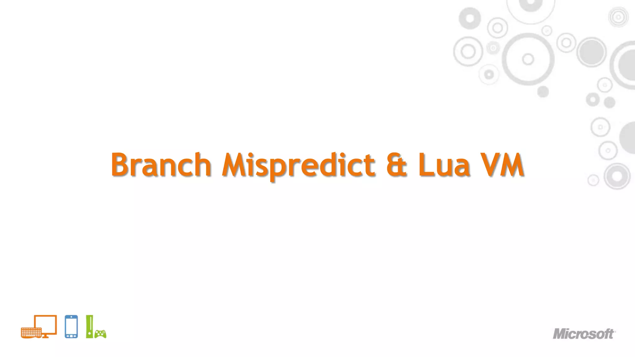 28. 28. Branch Mispredict & Lua VM<br />Problem…<br />The VM loop is mispredict-mungous<br />Switch statement is implemented using bctr instruction<br />Loads unknown & unpredictable value from memory (opcode)<br />Then branch on it<br />Simple branch prediction hardware on core:<br />Has 6 bit global history and 2 bit prediction scheme<br />Doesn’t have much of a chance in this case<br />Mispredict penalty grows linearly with opcode count<br />