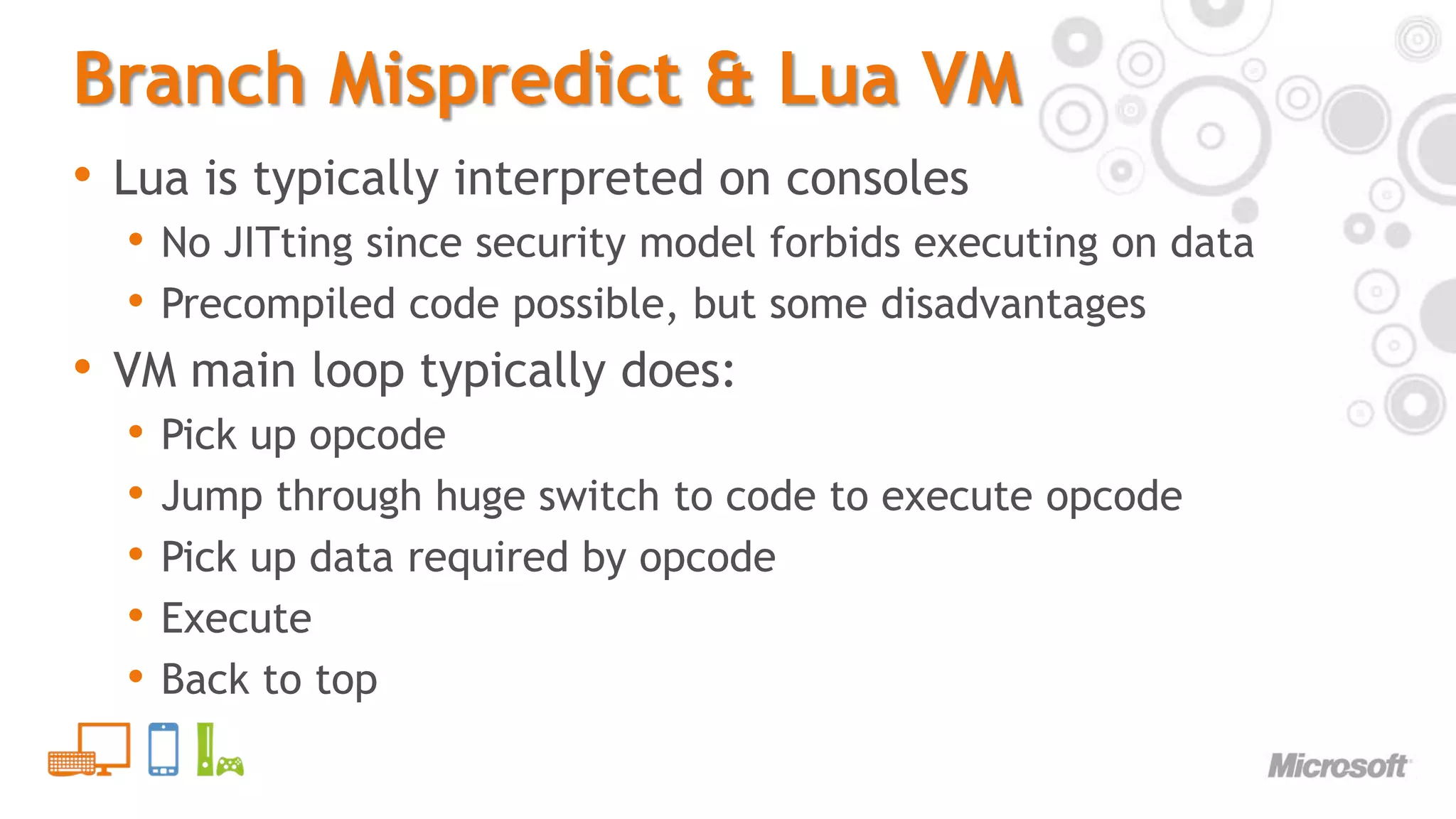 27. 27. Branch Mispredict & Lua VM<br />Lua is typically interpreted on consoles<br />No JITting since security model forbids executing on data<br />Precompiled code possible, but some disadvantages<br />VM main loop typically does:<br />Pick up opcode<br />Jump through huge switch to code to execute opcode<br />Pick up data required by opcode<br />Execute<br />Back to top<br />