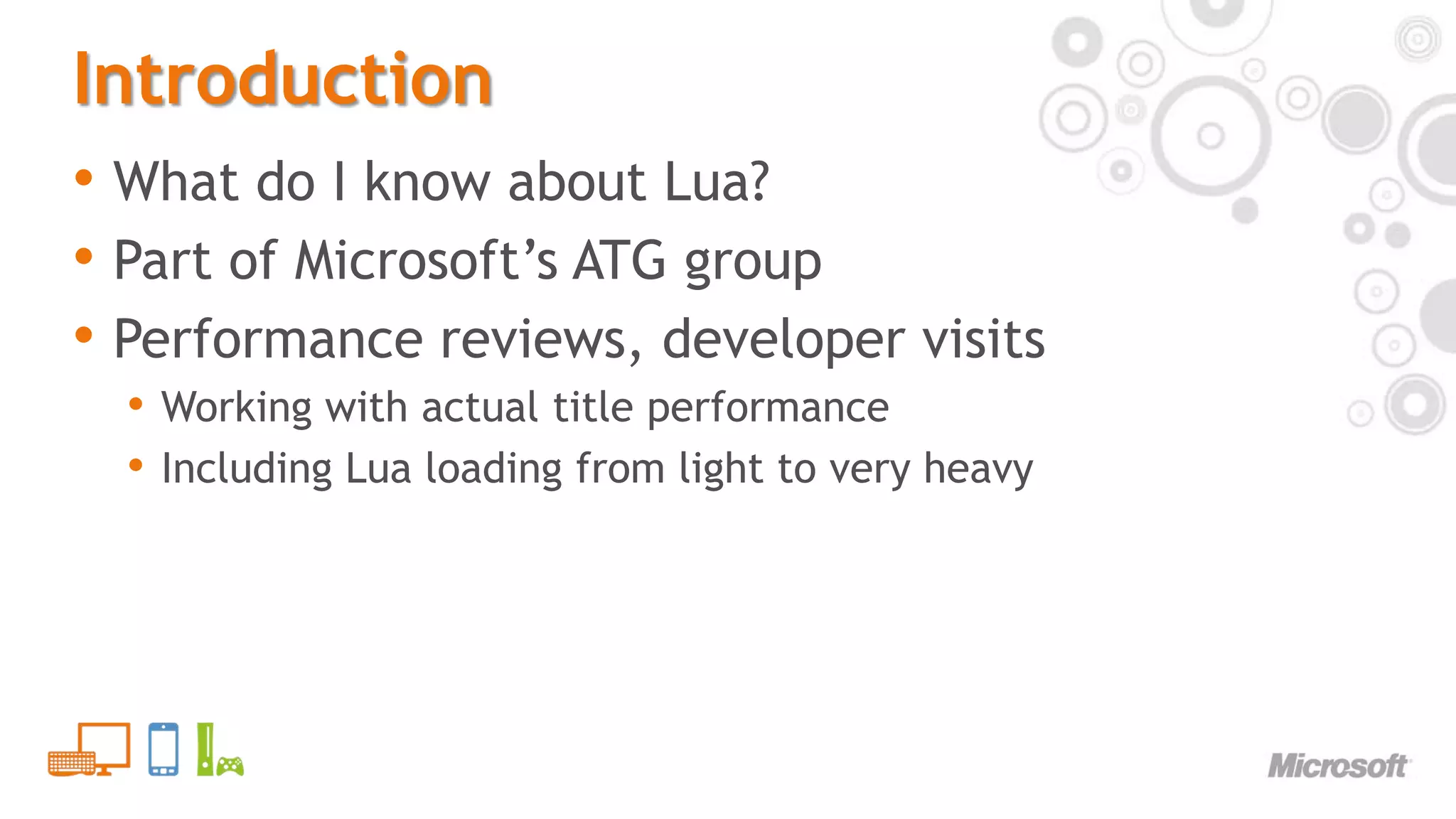 3. 3. Introduction<br />What do I know about Lua?<br />Part of Microsoft’s ATG group<br />Performance reviews, developer visits<br />Working with actual title performance<br />Including Lua loading from light to very heavy<br />