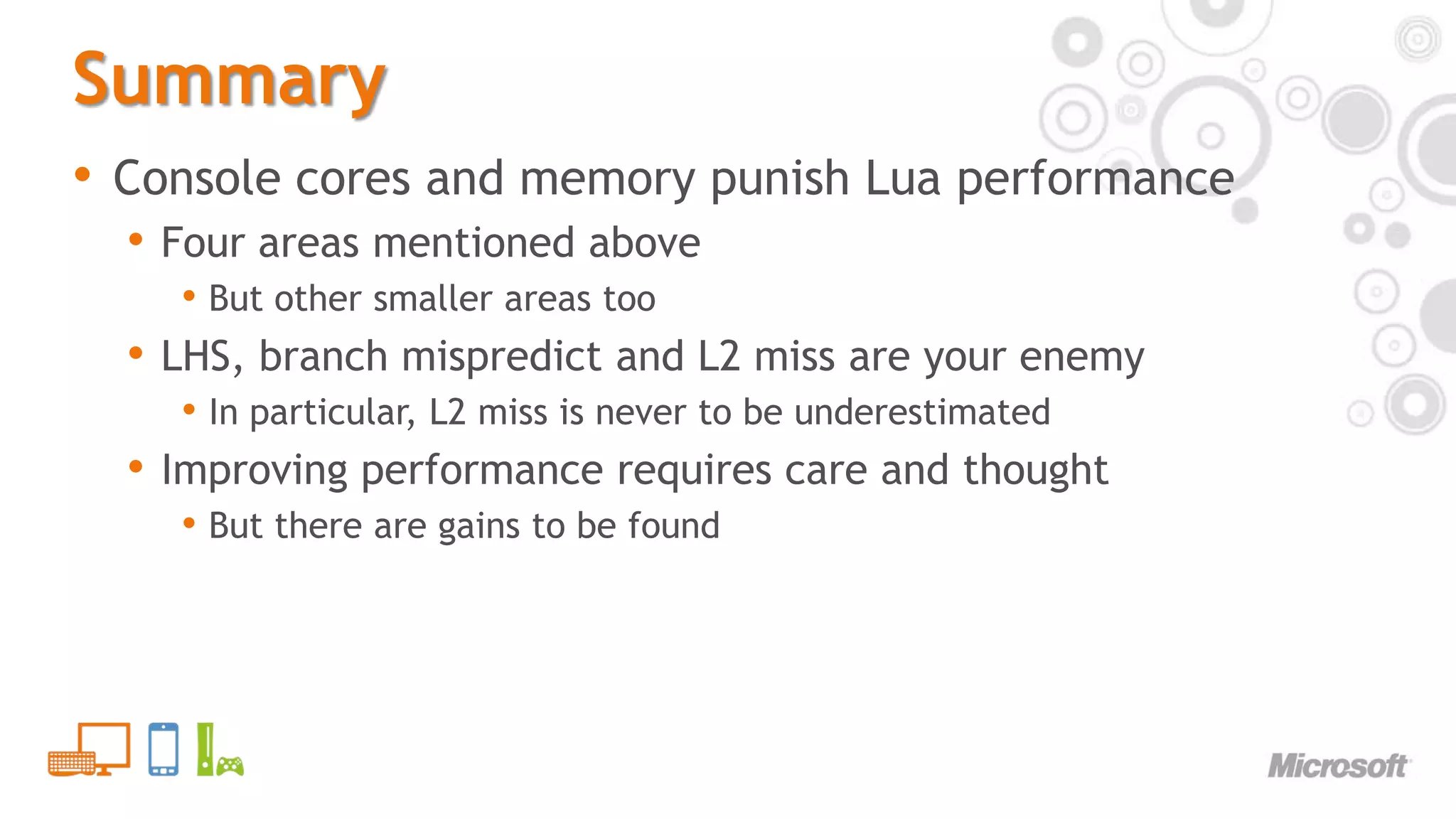 31. 31. Summary<br />Console cores and memory punish Lua performance<br />Four areas mentioned above<br />But other smaller areas too<br />LHS, branch mispredict and L2 miss are your enemy<br />In particular, L2 miss is never to be underestimated<br />Improving performance requires care and thought<br />But there are gains to be found<br />