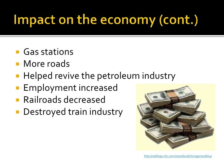 10. 10. Impact on the economy (cont.)<br />Gas stations<br />More roads<br />Helped revive the petroleum industry<br />Employment increased<br />Railroads decreased<br />Destroyed train industry<br />http://weblogs.cltv.com/news/local/chicago/2008/04/<br />