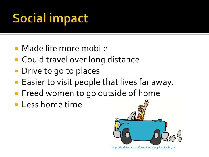 11. 11. Social impact<br />Made life more mobile<br />Could travel over long distance<br />Drive to go to places<br />Easier to visit people that lives far away.<br />Freed women to go outside of home<br />Less home time<br />http://thedailypos.org/forum/index.php?topic=8150.0<br />