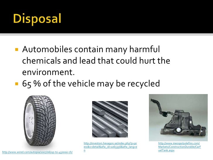 13. 13. Disposal<br />Automobiles contain many harmful chemicals and lead that could hurt the environment.<br />65 % of the vehicle may be recycled<br />http://investors.hexagon.se/index.php?p=press&s=detail&afw_id=1065356&afw_lang=en<br />http://www.ineospolyolefins.com/Markets/ConstructionDurable/CarFuelTank.aspx<br />http://www.wired.com/autopia/2007/06/up-to-450000-ch/<br />