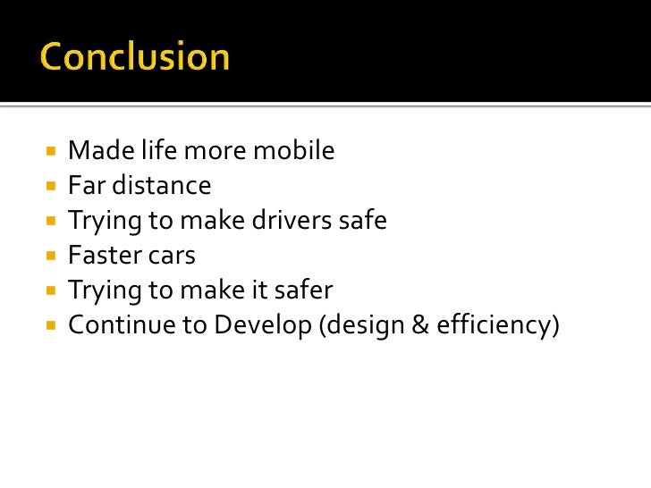 14. 14. Conclusion<br />Made life more mobile<br />Far distance<br />Trying to make drivers safe<br />Faster cars<br />Trying to make it safer<br />Continue to Develop (design & efficiency)<br />
