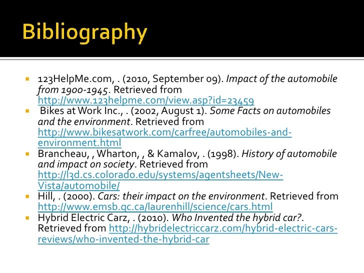 15. 15. Bibliography<br />123HelpMe.com, . (2010, September 09). Impact of the automobile from 1900-1945. Retrieved from http://www.123helpme.com/view.asp?id=23459<br /> Bikes at Work Inc., . (2002, August 1). Some Facts on automobiles and the environment. Retrieved from http://www.bikesatwork.com/carfree/automobiles-and-environment.html<br />Brancheau, , Wharton, , & Kamalov, . (1998). History of automobile and impact on society. Retrieved from http://l3d.cs.colorado.edu/systems/agentsheets/New-Vista/automobile/<br />Hill, . (2000). Cars: their impact on the environment. Retrieved from http://www.emsb.qc.ca/laurenhill/science/cars.html<br />Hybrid Electric Carz, . (2010). Who Invented the hybrid car?. Retrieved from http://hybridelectriccarz.com/hybrid-electric-cars-reviews/who-invented-the-hybrid-car<br />