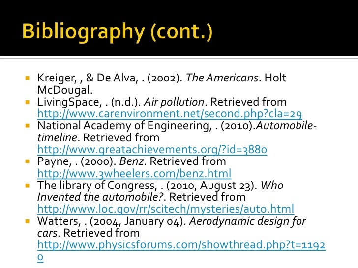 16. 16. Bibliography (cont.)<br />Kreiger, , & De Alva, . (2002). The Americans. Holt McDougal.<br />LivingSpace, . (n.d.). Air pollution. Retrieved from http://www.carenvironment.net/second.php?cla=29<br />National Academy of Engineering, . (2010).Automobile-timeline. Retrieved from http://www.greatachievements.org/?id=3880<br />Payne, . (2000). Benz. Retrieved from http://www.3wheelers.com/benz.html<br />The library of Congress, . (2010, August 23). Who Invented the automobile?. Retrieved from http://www.loc.gov/rr/scitech/mysteries/auto.html<br />Watters, . (2004, January 04). Aerodynamic design for cars. Retrieved from http://www.physicsforums.com/showthread.php?t=11920<br />