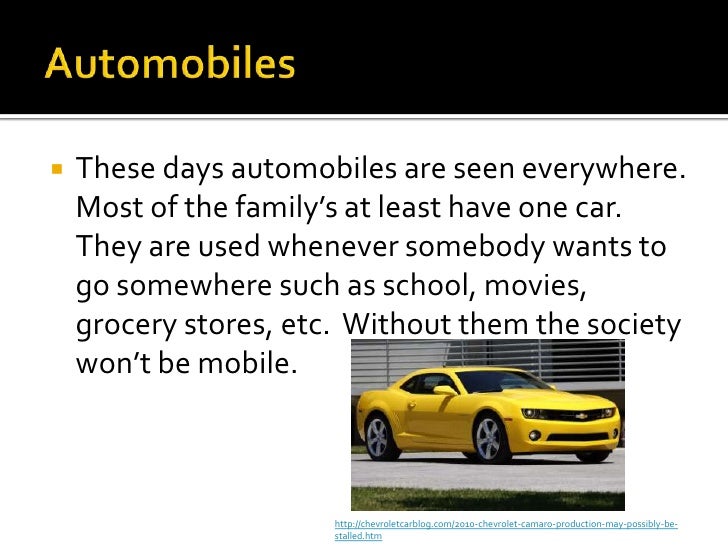 2. 2. Automobiles<br />These days automobiles are seen everywhere. Most of the family’s at least have one car. They are used whenever somebody wants to go somewhere such as school, movies, grocery stores, etc. Without them the society won’t be mobile.<br />http://chevroletcarblog.com/2010-chevrolet-camaro-production-may-possibly-be-stalled.htm<br />