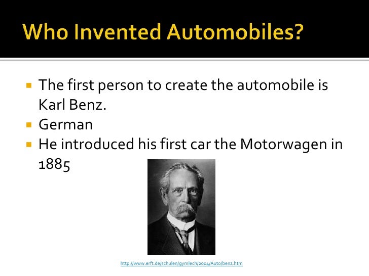 3. 3. Who Invented Automobiles?<br />The first person to create the automobile is Karl Benz.<br />German<br />He introduced his first car the Motorwagen in 1885<br />http://www.erft.de/schulen/gymlech/2004/Auto/benz.htm<br />