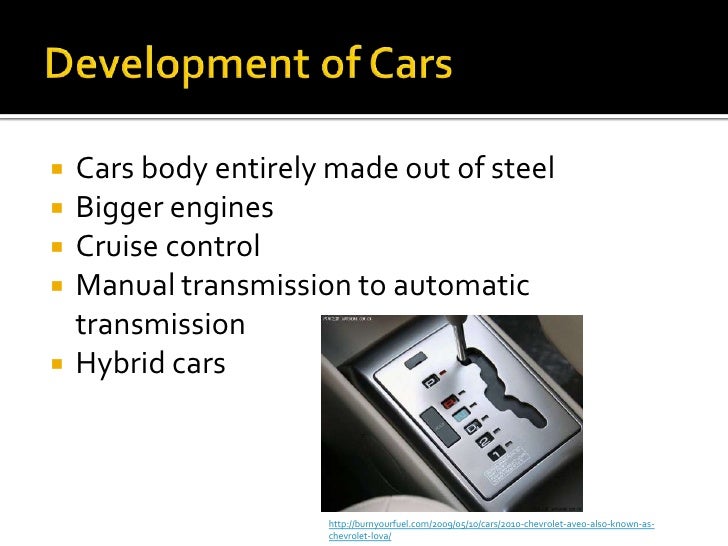 5. 5. Development of Cars<br />Cars body entirely made out of steel<br />Bigger engines<br />Cruise control<br />Manual transmission to automatic transmission<br />Hybrid cars<br />http://burnyourfuel.com/2009/05/10/cars/2010-chevrolet-aveo-also-known-as-chevrolet-lova/<br />
