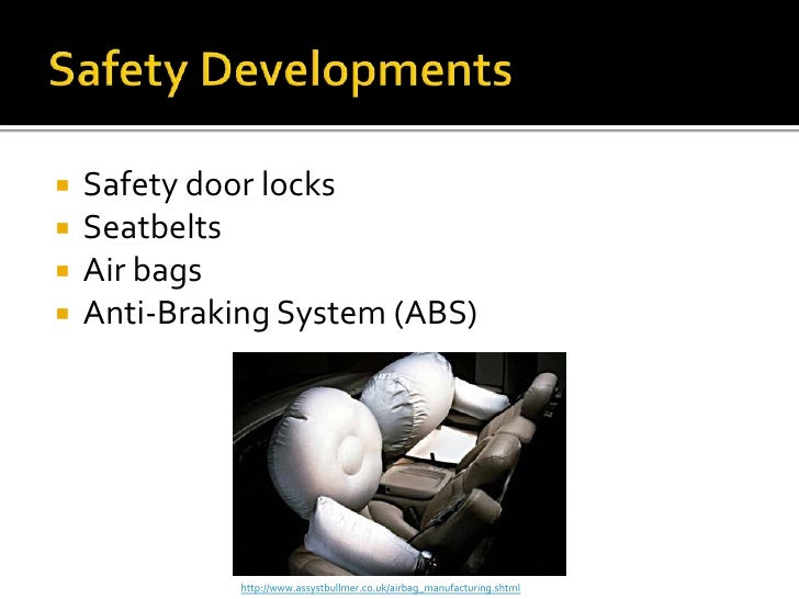 6. 6. Safety Developments<br />Safety door locks<br />Seatbelts<br />Air bags <br />Anti-Braking System (ABS)<br />http://www.assystbullmer.co.uk/airbag_manufacturing.shtml<br />