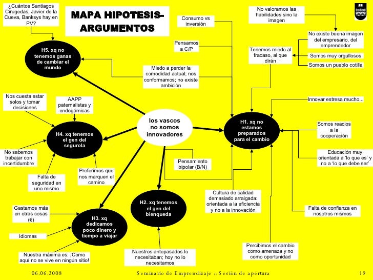 19. 19. los vascos no somos innovadores MAPA HIPOTESIS- ARGUMENTOS Somos muy orgullosos Somos un pueblo cotilla No existe buena imagen del empresario, del emprendedor Innovar estresa mucho... Educación muy orientada a ‘lo que es’ y no a ‘lo que debe ser’ Falta de confianza en nosotros mismos Pensamiento bipolar (B/N) Cultura de calidad demasiado arraigada: orientada a la eficiencia y no a la innovación Percibimos el cambio como amenaza y no como oportunidad Pensamos a C/P Consumo vs inversión Somos reacios a la cooperación No valoramos las habilidades sino la imagen H5. xq no tenemos ganas de cambiar el mundo ¿Cuántos Santiagos Cirugedas, Javier de la Cueva, Banksys hay en PV? H1. xq no estamos preparados para el cambio H4. xq tenemos el gen del segurola Tenemos miedo al fracaso, al que dirán Nos cuesta estar solos y tomar decisiones AAPP paternalistas y endogámicas No sabemos trabajar con incertidumbre Falta de seguridad en uno mismo Preferimos que nos marquen el camino H3. xq dedicamos poco dinero y tiempo a viajar Gastamos más en otras cosas (€) Idiomas Nuestra máxima es: ¡Como aquí no se vive en ningún sitio! Nuestros antepasados lo necesitaban; hoy no lo necesitamos H2. xq tenemos el gen del bienqueda Miedo a perder la comodidad actual; nos conformamos; no existe ambición