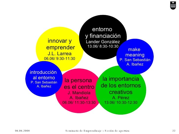 22. 22. innovar y emprender J.L. Larrea 06.06/ 9:30-11:30 la persona es el centro J. Mandiola A. Ibañez 06.06/ 11:30-13:30 entorno y financiación Lander González 13.06/ 8:30-10:30 la importancia de los entornos creativos A. Pérez 13.06/ 10:30-12:30 introducción al entorno P. San Sebastián A. Ibañez make meaning P. San Sebastián A. Ibañez