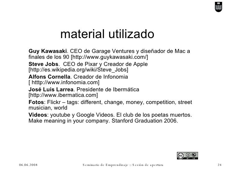 24. 24. material utilizado <ul><li>Guy Kawasaki . CEO de Garage Ventures y diseñador de Mac a finales de los 90 [http://www.guykawasaki.com/] </li></ul><ul><li>Steve Jobs . CEO de Pixar y Creador de Apple [http://es.wikipedia.org/wiki/Steve_Jobs] </li></ul><ul><li>Alfons Cornella . Creador de Infonomia [ htttp://www.infonomia.com] </li></ul><ul><li>José Luis Larrea . Presidente de Ibermática [http://www.ibermatica.com] </li></ul><ul><li>Fotos : Flickr – tags: different, change, money, competition, street musician, world </li></ul><ul><li>Videos : youtube y Google Videos. El club de los poetas muertos. Make meaning in your company. Stanford Graduation 2006. </li></ul>