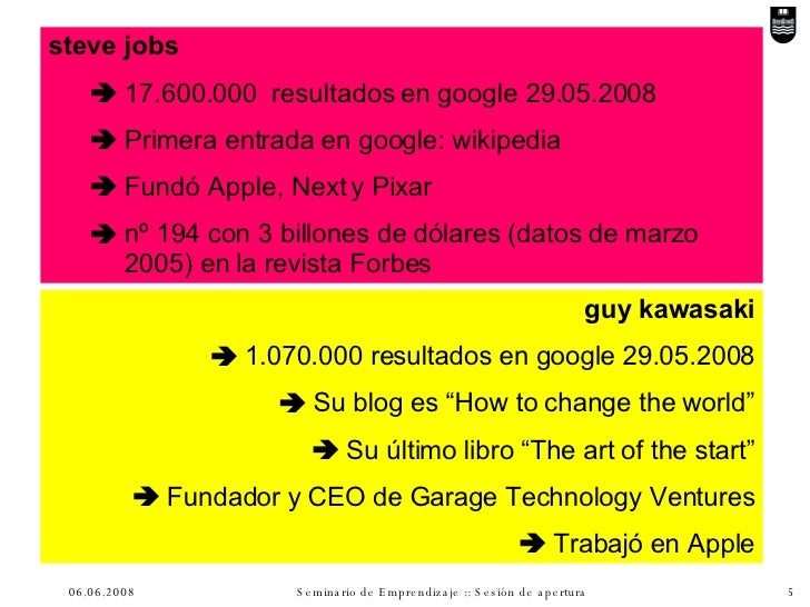 5. 5. <ul><li>steve jobs </li></ul><ul><ul><li>17.600.000 resultados en google 29.05.2008 </li></ul></ul><ul><ul><li>Primera entrada en google: wikipedia </li></ul></ul><ul><ul><li>Fundó Apple, Next y Pixar </li></ul></ul><ul><ul><li>nº 194 con 3 billones de dólares (datos de marzo 2005) en la revista Forbes </li></ul></ul><ul><li>guy kawasaki </li></ul><ul><ul><li>1.070.000 resultados en google 29.05.2008 </li></ul></ul><ul><ul><li>Su blog es “How to change the world” </li></ul></ul><ul><ul><li>Su último libro “The art of the start” </li></ul></ul><ul><ul><li>Fundador y CEO de Garage Technology Ventures </li></ul></ul><ul><ul><li>Trabajó en Apple </li></ul></ul>
