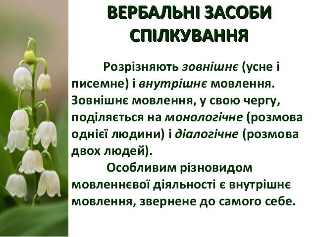 12. 12. ВЕРБАЛЬНІ ЗАСОБИВЕРБАЛЬНІ ЗАСОБИ СПІЛКУВАННЯСПІЛКУВАННЯ Розрізняють зовнішнє (усне і писемне) і внутрішнє мовлення. Зовнішнє мовлення, у свою чергу, поділяється на монологічне (розмова однієї людини) і діалогічне (розмова двох людей). Особливим різновидом мовленнєвої діяльності є внутрішнє мовлення, звернене до самого себе.