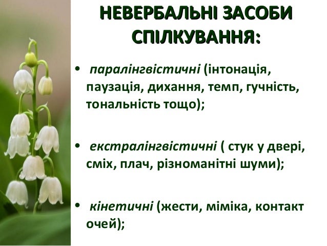 13. 13. НЕВЕРБАЛЬНІ ЗАСОБИНЕВЕРБАЛЬНІ ЗАСОБИ СПІЛКУВАННЯ:СПІЛКУВАННЯ: • паралінгвістичні (інтонація, паузація, дихання, темп, гучність, тональність тощо); • екстралінгвістичні ( стук у двері, сміх, плач, різноманітні шуми); • кінетичні (жести, міміка, контакт очей);