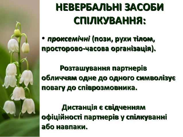 14. 14. НЕВЕРБАЛЬНІ ЗАСОБИНЕВЕРБАЛЬНІ ЗАСОБИ СПІЛКУВАННЯ:СПІЛКУВАННЯ: • проксемічніпроксемічні (пози, рухи тілом,(пози, рухи тілом, просторово-часова організація).просторово-часова організація). Розташування партнерівРозташування партнерів обличчям одне до одного символізуєобличчям одне до одного символізує повагу до співрозмовника.повагу до співрозмовника. Дистанція є свідченнямДистанція є свідченням офіційності партнерів у спілкуванніофіційності партнерів у спілкуванні або навпаки.або навпаки.