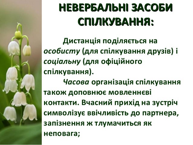 15. 15. НЕВЕРБАЛЬНІ ЗАСОБИНЕВЕРБАЛЬНІ ЗАСОБИ СПІЛКУВАННЯ:СПІЛКУВАННЯ: Дистанція поділяється на особисту (для спілкування друзів) і соціальну (для офіційного спілкування). Часова організація спілкування також доповнює мовленнєві контакти. Вчасний прихід на зустріч символізує ввічливість до партнера, запізнення ж тлумачиться як неповага;