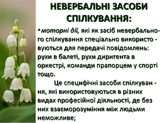 16. 16. НЕВЕРБАЛЬНІ ЗАСОБИНЕВЕРБАЛЬНІ ЗАСОБИ СПІЛКУВАННЯ:СПІЛКУВАННЯ: •моторні дії,моторні дії, які як засіб невербально-які як засіб невербально- го спілкування спеціально використо -го спілкування спеціально використо - вуються для передачі повідомлень:вуються для передачі повідомлень: рухи в балеті, рухи диригента врухи в балеті, рухи диригента в оркестрі, команди прапорцем у спортіоркестрі, команди прапорцем у спорті тощо.тощо. Це специфічні засоби спілкуван -Це специфічні засоби спілкуван - ня, які використовуються в різнихня, які використовуються в різних видах професійної діяльності, де безвидах професійної діяльності, де без них взаєморозуміння між людьминих взаєморозуміння між людьми неможливе;неможливе;