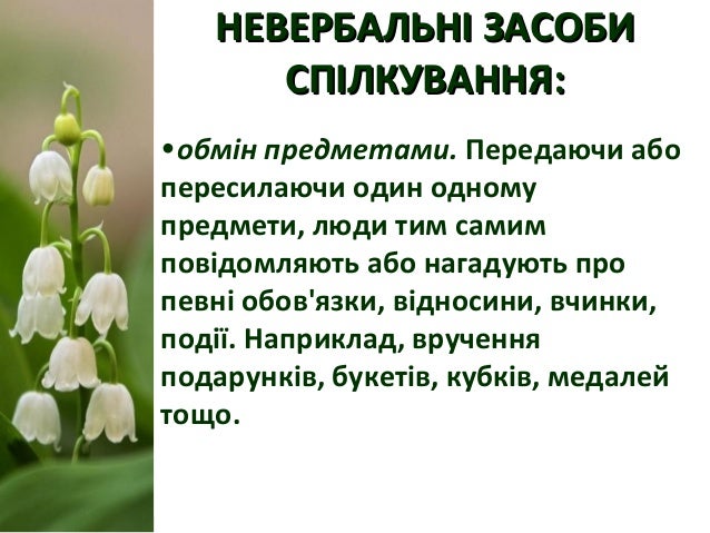 17. 17. НЕВЕРБАЛЬНІ ЗАСОБИНЕВЕРБАЛЬНІ ЗАСОБИ СПІЛКУВАННЯ:СПІЛКУВАННЯ: •обмін предметами. Передаючи або пересилаючи один одному предмети, люди тим самим повідомляють або нагадують про певні обов'язки, відносини, вчинки, події. Наприклад, вручення подарунків, букетів, кубків, медалей тощо.
