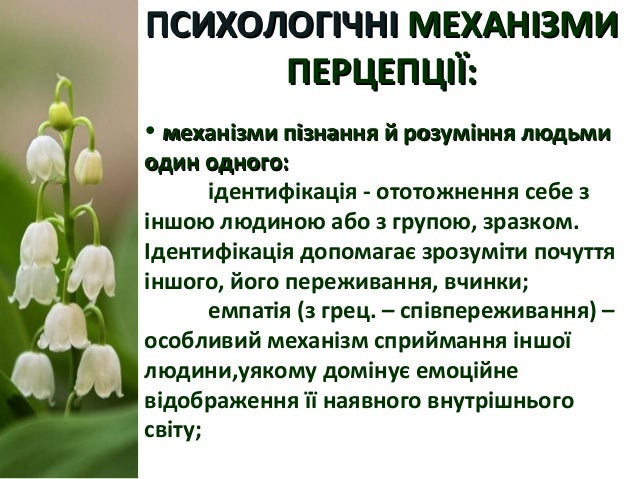 19. 19. ПСИХОЛОГІЧНІПСИХОЛОГІЧНІ МЕХАНІЗМИМЕХАНІЗМИ ПЕРЦЕПЦІЇ:ПЕРЦЕПЦІЇ: • механізми пізнання й розуміння людьмимеханізми пізнання й розуміння людьми один одного:один одного: ідентифікація - ототожнення себе з іншою людиною або з групою, зразком. Ідентифікація допомагає зрозуміти почуття іншого, його переживання, вчинки; емпатія (з грец. – співпереживання) – особливий механізм сприймання іншої людини,уякому домінує емоційне відображення її наявного внутрішнього світу;