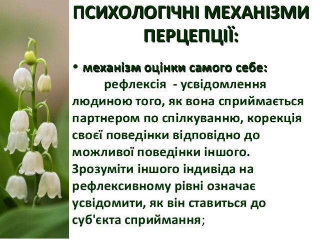 20. 20. ПСИХОЛОГІЧНІ МЕХАНІЗМИПСИХОЛОГІЧНІ МЕХАНІЗМИ ПЕРЦЕПЦІЇ:ПЕРЦЕПЦІЇ: • механізм оцінки самого себе:механізм оцінки самого себе: рефлексія - усвідомлення людиною того, як вона сприймається партнером по спілкуванню, корекція своєї поведінки відповідно до можливої поведінки іншого. Зрозуміти іншого індивіда на рефлексивному рівні означає усвідомити, як він ставиться до суб'єкта сприймання;