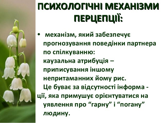 21. 21. ПСИХОЛОГІЧНІ МЕХАНІЗМИПСИХОЛОГІЧНІ МЕХАНІЗМИ ПЕРЦЕПЦІЇ:ПЕРЦЕПЦІЇ: • механізм, який забезпечує прогнозування поведінки партнера по спілкуванню: каузальна атрибуція – приписування іншому непритаманних йому рис. Це буває за відсутності інформа - ції, яка примушує орієнтуватися на уявлення про “гарну” і “погану” людину.