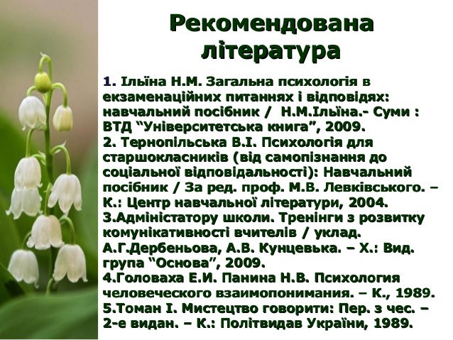 23. 23. РекомендованаРекомендована літературалітература 1.1. Ільїна Н.М. Загальна психологія вІльїна Н.М. Загальна психологія в екзаменаційних питаннях і відповідях:екзаменаційних питаннях і відповідях: навчальний посібник / Н.М.Ільїна.- Суми :навчальний посібник / Н.М.Ільїна.- Суми : ВТД “Університетська книга”, 2009.ВТД “Університетська книга”, 2009. 2.2. Тернопільська В.І. Психологія дляТернопільська В.І. Психологія для старшокласників (від самопізнання достаршокласників (від самопізнання до соціальної відповідальності): Навчальнийсоціальної відповідальності): Навчальний посібник / За ред. проф. М.В. Левківського. –посібник / За ред. проф. М.В. Левківського. – К.: Центр навчальної літератури, 2004.К.: Центр навчальної літератури, 2004. 3.3.Адміністатору школи. Тренінги з розвиткуАдміністатору школи. Тренінги з розвитку комунікативності вчителів / уклад.комунікативності вчителів / уклад. А.Г.Дербеньова, А.В. Кунцевька. – Х.: Вид.А.Г.Дербеньова, А.В. Кунцевька. – Х.: Вид. група “Основа”, 2009.група “Основа”, 2009. 4.4.Головаха Е.И.Головаха Е.И. Панина Н.В. ПсихологияПанина Н.В. Психология человеческого взаимопонимания. – К., 1989.человеческого взаимопонимания. – К., 1989. 5.5.Томан І. Мистецтво говорити: Пер. з чес. –Томан І. Мистецтво говорити: Пер. з чес. – 2-е ви2-е видан. – К.: Політвидав України, 1989.дан. – К.: Політвидав України, 1989.