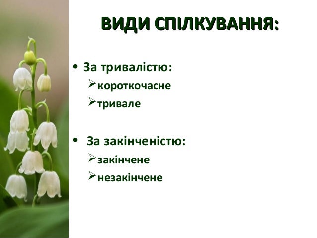 4. 4. ВИДИ СПІЛКУВАННЯ:ВИДИ СПІЛКУВАННЯ: • За тривалістю: короткочасне тривале • За закінченістю: закінчене незакінчене