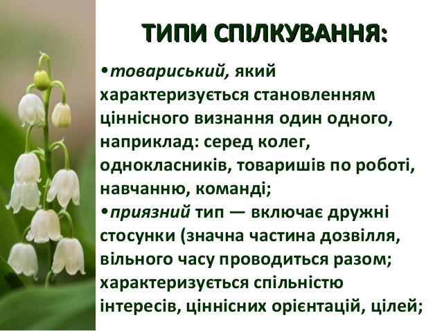 6. 6. ТИПИ СПІЛКУВАННЯ:ТИПИ СПІЛКУВАННЯ: •товариський, який характеризується становленням ціннісного визнання один одного, наприклад: серед колег, однокласників, товаришів по роботі, навчанню, команді; •приязний тип — включає дружні стосунки (значна частина дозвілля, вільного часу проводиться разом; характеризується спільністю інтересів, ціннісних орієнтацій, цілей;