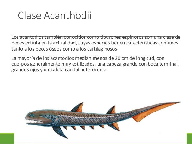 10. 10. Clase Acanthodii Los acantodios también conocidos como tiburones espinosos son una clase de peces extinta en la actualidad, cuyas especies tienen características comunes tanto a los peces óseos como a los cartilaginosos La mayoría de los acantodios medían menos de 20 cm de longitud, con cuerpos generalmente muy estilizados, una cabeza grande con boca terminal, grandes ojos y una aleta caudal heterocerca